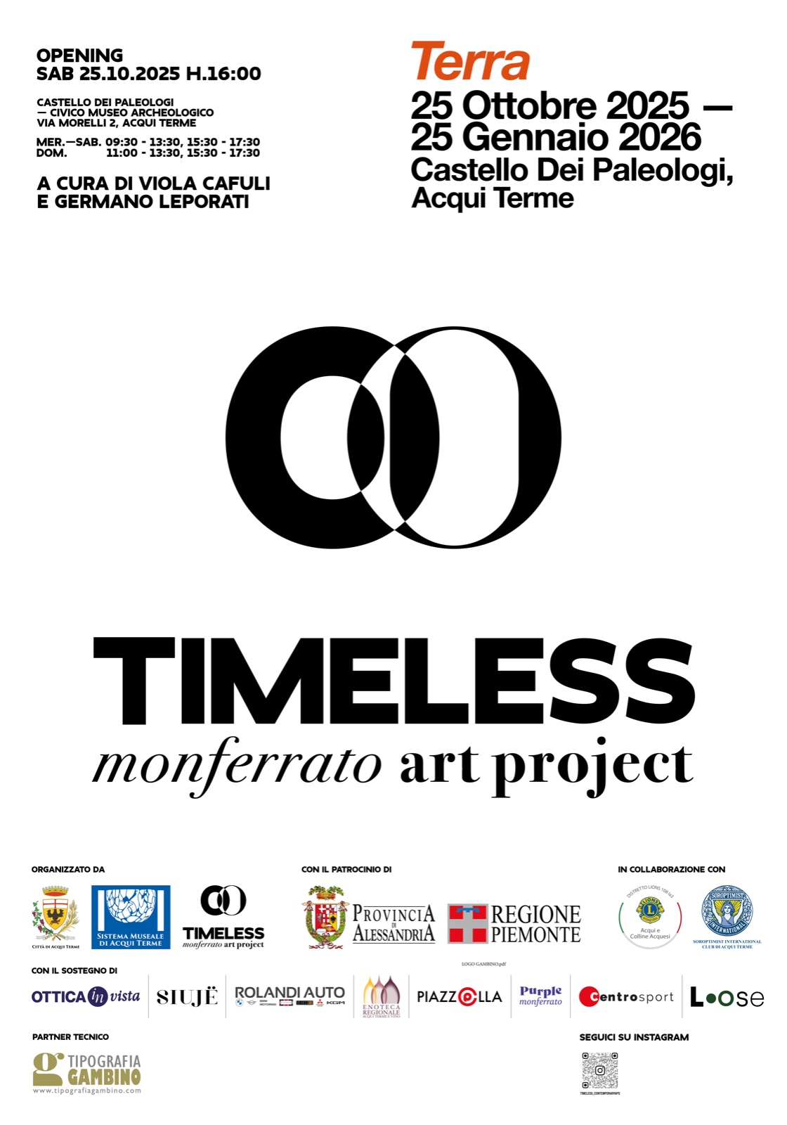 Dal 25 Ottobre 2025 al 25 Gennaio 2026, il Castello dei Paleologi di Acqui Terme accoglie la seconda edizione di TIMELESS MONFERRATO ART PROJECT, a cura di Viola Cafuli e Germano Leporati, trasformando i suoi spazi storici in un palcoscenico per l’arte contemporanea. Un dialogo potente tra memoria e visione, tra il fascino archeologico del castello e le installazioni immersive di Davide Cedolin e Drop Kollektiv, che portano video, suono e luce dentro la pietra, creando un’esperienza sensoriale e intima. Il tema di quest’anno è “Terra”: radice e orizzonte, materia viva e metafora di appartenenza. Timeless trasforma un luogo simbolo della storia locale in un terreno di sperimentazione, dove il passato incontra la ricerca artistica più attuale. Un invito a lasciarsi attraversare dall’arte, in uno spazio che respira insieme al tempo.